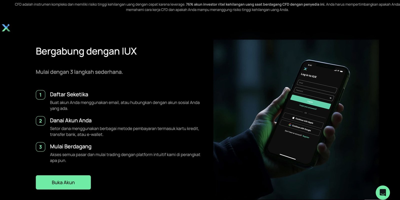 Namun, trader Indonesia perlu mencatat bahwa IUX belum berlisensi BAPPEBTI, sehingga trading tetap memiliki risiko regulasi.