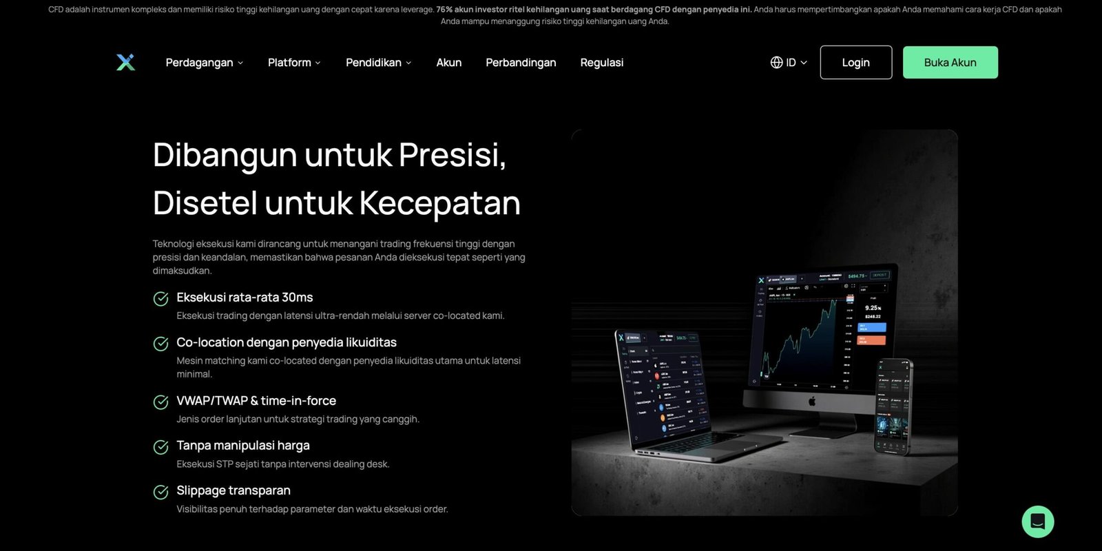 - Eksekusi order <30 milidetik (server Equinix LD4).